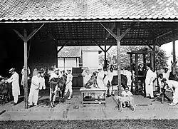 Following the closure of IVS, from 1875 to 1880, education took the form of an internship with a government veterinarian (gouvernements veearts) in Purwokerto.[35][33] Nine native youths underwent internships under the guidance of seven government veterinarians, and eight of them graduated in 1880.[33] Shortly after, the Dutch East Indies experienced outbreaks of various animal diseases, beginning with rinderpest in 1875, followed by anthrax and hemorrhagic septicemia in 1884, surra in 1886, and foot-and-mouth disease in 1887.[25][29] Rabies, a lethal disease affecting both animals and humans, was first reported in 1884 in a buffalo. The disease was then discovered in dogs in 1889 and in humans in 1894.[37] In response to these outbreaks, the first veterinary organization was established in 1884 under the name the Dutch East Indies Veterinary Association (Nederland-Indische Vereeniging voor Diergeneeskunde).[25]