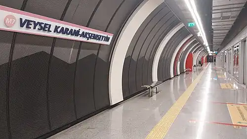 Veysel Karani-Akşemsettin is an underground station on the M7 line of the Istanbul Metro.[1][2] It is located on Atatürk Boulevard in the Akşemsettin neighbourhood of Eyüp. It was opened on 28 October 2020.[3]