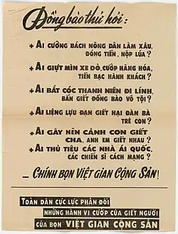 Since 1945, the Viet Minh have officially used it in legal documents to refer to the Vietnamese who cooperated or collaborated with French colonists. The policies of the Viet Minh include "arming the people, punishing the Việt gian" and "confiscation of the assets of the French and Japanese imperialists and the Việt gian." On January 20, 1953, Ho Chi Minh issued Order No. 133-SL in North Vietnam to punish the Việt gian.[2][3][4]