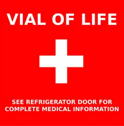 Originally, Vial of Life kits came with a plastic vial (an empty pill bottle or another container). The vial would be labeled with a Vial of Life decal, and the completed medical information form would be placed inside.[16] These plastic vials tended to get lost in the refrigerator, pushed towards the back over time, making them hard to find for emergency crews. Nowadays, most programs ask patients to place their completed medical form inside of a plastic Ziploc bag,[17] which is then placed on the front of the refrigerator with a Vial of Life decal on it.