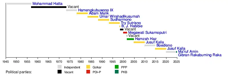 For the next 17 years, the vice presidency remained vacant. In December 1965, there were calls for a vice president to be named to assist President Sukarno during the times of uncertainty.[8] The idea did not gain momentum, and the vice presidency continued to remain vacant as the presidency passed over from Sukarno to General Suharto.