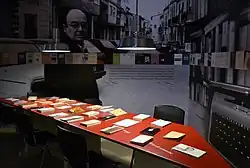 There is also a bronze statue in Emilio Castelar square, in Burjassot, Andrés Estellés's birthplace. This piece, showing him sitting on a park bench, writing on top of a pile of books, has suffered four loutish attacks. For instance, it was covered in blue paint and the arms of his glasses were broken.[5] Likewise, extreme right blavers attempted to destroy a bust of Estellés that was put up in Burjassot in 1979.[6]