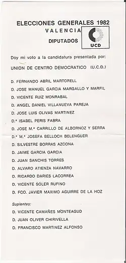 Shortly afterwards he joined the Union of the Democratic Centre (UCD) and was elected to the Spanish Congress of Deputies for Valencia Province at the 1979 General Election, serving until 1982. Within the UCD he was one of those who argued for greater autonomy for the Valencian Community[3] at a time when an internal conflict was underway within the UCD over the future status of the Valencian Community and the symbols to be used there. Consequently he spoke at party meetings in Spanish rather than Valencian in order to avoid being branded as "Catalanist."[3]