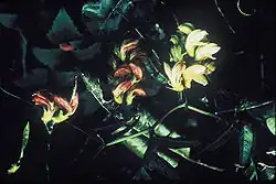 This plant is a liana which climbs into the surrounding trees, reaching a maximum length of 20 meters.[1][3] A study found the average length of the vine to be 2.6 meters, with a maximum of 12.5 meters in the sample. The vine also branches and climbs in different directions. It may spread along the ground or over detritus for a few meters before climbing upward, but plants were observed climbing 8 meters up into the canopy.[4] The leaves are 10 to 13 centimeters long and are made up of several pairs of leaflets each measuring up to 7 centimeters long by 3 wide. The leaves have tendrils at their tips. The plant produces inflorescences of 6 to 9 flowers with curving corollas up to 3 centimeters long. The flowers are yellowish white turning rose-pink with maturity and then purplish with age. The fruit is a black legume pod 9 or 10 centimeters long containing spherical black seeds.[3]