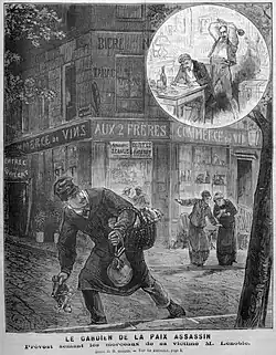 Prévost also had a mistress named Adèle Blondin.[Note 7] She had been for some time the governess of a rich old man who, to thank her, had left her a sum of 30,000 francs. Blondin sometimes helped her impoverished sister but, being economical, she lived on a monthly income of 1,500 francs from its capital placed in state annuity. Blondin bought a business and began earning a few thousand francs worth of money. Being suspicious, she usually hid her values, money and main jewellery.[18] On Sunday, 27 February 1876, she went to lunch at Prévost's house, who at the time lived at 22 Rue de l'Évangile, in front of the police station where he worked. Her landlady saw her leaving, adorned with her jewels and wrapped with a Scottish shawl.