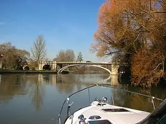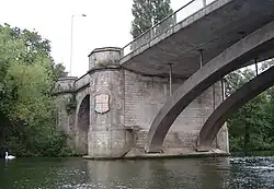 The Victoria and Albert Bridges in Datchet were built to replace the old Datchet Bridge as part of the re-routing of the Datchet to Windsor roads following the expansion of the grounds of Windsor Castle. Prince Albert is said to have had a part in the design[2] Victoria Bridge was built in 1851, paid for partly by the Windsor, Staines and Richmond Railway Company who were keen to have access to Windsor across part of the castle property. The original bridge was built of cast iron with stone abutments. The bridge was severely damaged by a group of tanks crossing it during World War II but was not closed until 1963, operating with weight restrictions. There was a temporary Bailey bridge until 1966,[3] then the central crossing was replaced by a concrete structure and reopened in 1967. Under the terms of the original contract, British Rail were required to contribute to the cost.[4] The Thames Path crosses the bridge rejoining the original towpath on the Windsor side for the northern part of Home Park, the towpath access in Home Park, Windsor having been lost due to the Windsor Castle Act 1848.