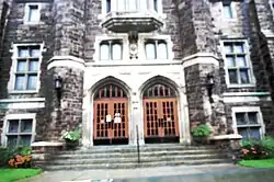 It is three storeys tall, and is made in the neo-Tudor style of sandstone lined with Indiana freestone.[3] Made of sandstone are the Gothic details, the crenellated, square tower, the four corner turrets at the sides, the buttresses supporting the two wings, as well as the oriel window located above the ogival doors.[1] It is similar to Westmount City Hall in that both have a Tudor influence.[3]