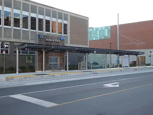 Victoria Park is a stop on the Region of Waterloo's Ion rapid transit system. It is located alongside Charles Street, just west of Gaukel Street, in Kitchener.[1] Its namesake, Victoria Park, has its eastern entrance about 100 metres (330 ft) south of the station along Gaukel. It opened in 2019.