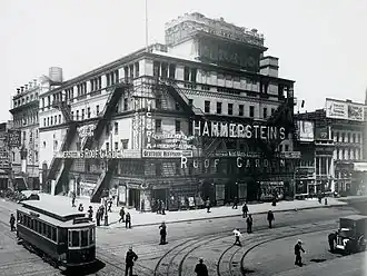 The Victoria Theatre was an American vaudeville house during the early years of the twentieth century. Theatre mogul Oscar Hammerstein I opened it in 1899 on the northwest corner of Seventh Avenue and 42nd Street, along New York City's Longacre Square (now Times Square).[3] The theatre was closely associated with the Paradise Roof Garden above it, and the two venues came to be known collectively as Hammerstein's.[4] The Victoria closed in 1915.