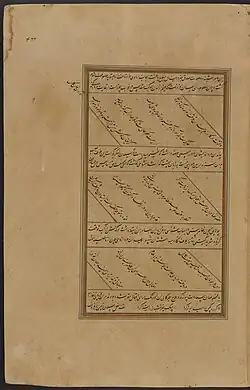 - ^ The painting has been cut off all around; the studio notes with references to the painters have also been lost. Marcus Fraser for Sotheby's, Arts of the Islamic World, Auction from October 23, 2019, Lot 175