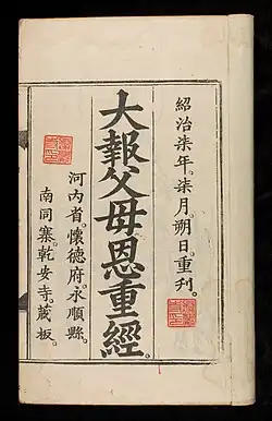 The title page of Đại báo phụ mẫu ân trọng kinh 大報父母恩重經, which has the publishing date on the right.