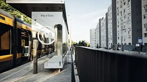 Vila d'Este is a light rail station that is the terminus of line D of the Porto Metro system in Vila Nova de Gaia, Portugal. The station opened, along with the extension of line D from its previous terminus at Santo Ovídio, on 28 June 2024.[1][2]