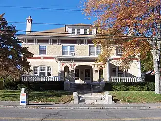 Villa Friuli is located northwest of downtown Torrington, on the west side of High Street at its junction with Central Avenue. It is a 2+1⁄2-story masonry structure, built out of terra cotta tile covered in stucco, and topped by a low-pitch hip roof. The roof is pierced by hip-roof dormers, and has extended eaves supported by paired large Stick style brackets. The facade is a symmetrical four bays wide, with a projecting single-story porch sheltering the center two bays. The outer first-floor bays have three-part windows set in segmented-arch openings, while the upper-level windows are sash, in pairs in the center bays and singly in the outer ones.[2]