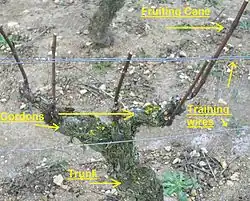 While closely related, the terms trellising, pruning and vine training are often used interchangeably even though they refer to different things. Technically speaking, the trellis refers to the actual stakes, posts, wires or other structures that the grapevine is attached to. Some vines are allowed to grow free standing without any attachment to a trellising structure. Part of the confusion between trellising and vine training systems stems from the fact that vine training systems will often take on the name of the particular type of trellising involved.[3] Pruning refers to the cutting and shaping of the cordon or "arms" of the grapevine in winter which will determine the number of buds that are allowed to become grape clusters.[4] In some wine regions, such as France, the exact number of buds is outlined by Appellation d'origine contrôlée (AOC) regulations. During the summer growing season, pruning can involve removing young plant shoots or excess bunches of grapes with green harvesting. Vine training systems utilize the practice of trellising and pruning in order to dictate and control a grape vine's canopy which will influence the potential yield of that year's crop as well as the quality of the grapes due to the access of air and sunlight needed for the grapes to ripen fully and for preventing various grape diseases.[5]