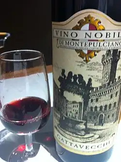 Vino Nobile di Montepulciano is a red wine with a denominazione di origine controllata e garantita status produced in the vineyards surrounding the town of Montepulciano, Italy.[1] The wine is made primarily from the Sangiovese grape varietal (known locally as Prugnolo gentile) (minimum 70%), blended with Canaiolo Nero (10%–20%) and small amounts of other local varieties such as Mammolo. The wine is aged for 2 years (at least 1 year in oak barrels); three years if it is a riserva. The wine should not be confused with Montepulciano d'Abruzzo, a red wine made from the Montepulciano grape in the Abruzzo region of east-central Italy.