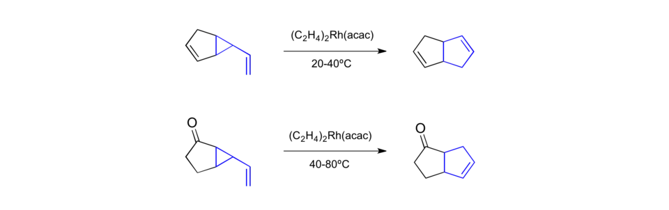 Vinylcyclopropane rearrangements are amenable to transition metal catalysts. Dirhodium acetate catalyzes the rearrangements from room temperature to 80 °C.y[35][36]