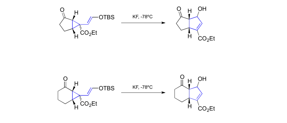A synthesis of Aphidicolin use methodology around the vinylcyclopropane rearrangement developed in their own laboratory .[40] A key step converts a late stage siloxyvinylcyclopropane into a cyclopentene that contained the [6-6-5]-fused carbon skeleton found within the natural product. The rearranged product into the natural product by further manipulations.