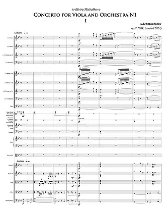 The Viola Concerto No. 1, Op. 7, was composed by Airat Ichmouratov in 2004. It was commissioned and premiered by Elvira Misbakhova, a Canadian violist, today the principal viola of Orchestre Métropolitain,[1] who was in 2004 a student at University of Montreal and was looking for new romantic viola concerto for her Doctoral program recital. Concerto was premiered at Claude Champagne Concert Hall in Montreal, Canada on 24 February 2005 by students of University of Montreal under the baton of composer Airat Ichmouratov.[2][3]