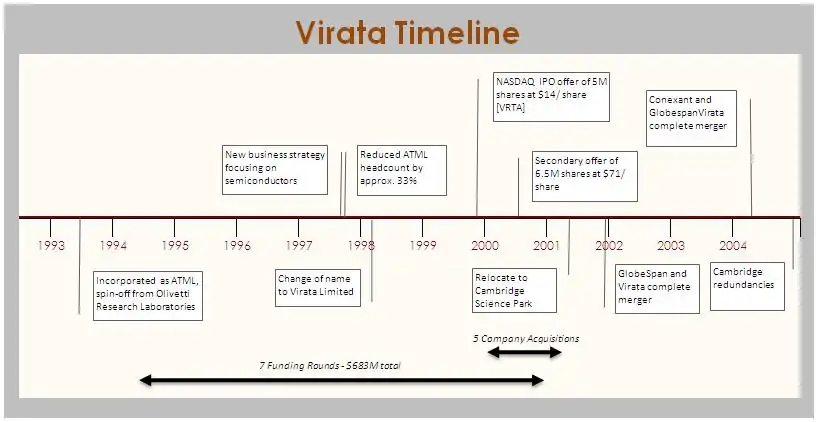Financial backing for the ATML and Virata Ltd business came in the form of five rounds of VC funding, raising a total of $71 million. An IPO and Secondary Offering would come later.
