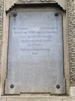 Isten Anyjának, a [magyarok] Védőasszonyának. Dózsa György († 1514) kegyetlen halála helyén, melyet évszázadok hagyománya őriz, kegyeletes engesztelésül ajánlják ez emlékművet Temesvár városa és lakossága. 1906. |