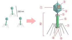 Tailed bacteriophage structure: (1) head, (2) tail, (3) DNA, (4) capsid, (5) collar, (6) sheath, (7) tail fibres, (8) spikes, (9) base plate