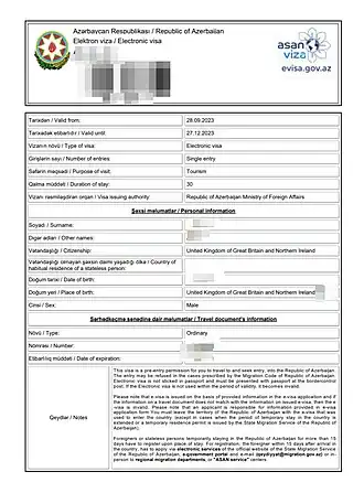 ![]() Azerbaijan electronic visa issued to a British citizen | |