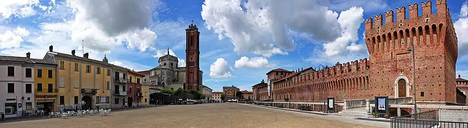 The facade of the castle occupies the entire northern side of the central Piazza Vittorio Veneto.