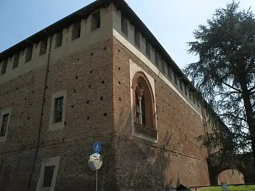 Filippo Maria Visconti enlarged the castle in the 15th century. He also added a wide mullioned window near the western corner, as attested by its central marble column, bearing the initials FM, which stands for Filippo Maria.[1][3] Filippo Maria also built the Naviglio di Bereguardo, which connected the Naviglio Grande at Abbiategrasso, about 17 kilometres (11 mi) north, with the castle. The dukes of Milan could then go from Milan to Bereguardo by boat, navigating along the Naviglio Grande until Abbiategrasso and the Naviglio di Bereguardo until the castle.[4]