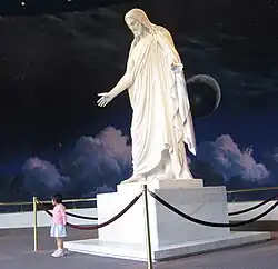 One of the focal points of the center is a life size replica of the Christus, with the accompanying statues of the original apostles carved out of Carrara marble.[49] This is the same marble used to create the Parthenon, Pietà, and David.[50] Behind the statues, Joseph Brickley painted a mural.[51]