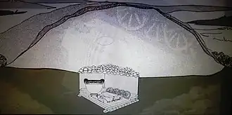 The inhumation burial was placed in a 4 m x 4 m rectangular wooden chamber underneath a mound or tumulus of earth and stone which originally measured 42 m in diameter and 5 m in height.