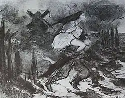 In his noted 1958 psychological study of this novella,[36] Slavicist Hugh McLean identifies the running motif of sexual fulfillment resulting in punishment in this Gogol collection, so that when the student Khoma engages in the ride of the witch, "an obviously sexual act", death is meted out as punishment.[37] In 2009, Romanchuk undertook a supplementary understanding of this schema using Lacanian analysis, where Khoma's resistance using prayer is an enactment of his perversion, defined as "a wish for a father's Law that reveals its absence".[38] McLean's analysis was poorly received by Soviet scholars at the time.[39]