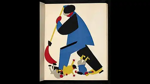 In the 1910s and 1920s, he kept company with many of the most influential figures in the radical Soviet avant-garde art movement, among them constructivist Vladimir Tatlin, cubo-futurist Ivan Puni, suprematist Kazimir Malevich, futurist Vladimir Mayakovsky and acmeist and formalist literary critic Nikolay Punin.[6][10][11] In the mid-1920s, he partnered with poet Samuil Marshak to create both picture books and politically conscious "production books." The latter form, unique to the Soviet Union, told stories that taught children about "the world of workers and how things are made"[3][12] Their titles included: Circus, Ice Cream, Tale About a Foolish Mouse, Moustached and Striped, Book of Many Colours, Twelve Months and Luggage, as well as The Table, How a Plane Made a Plane, Bread, My Little Book about the Seas and the Lighthouse, the Mail, and On the River.[1][3]