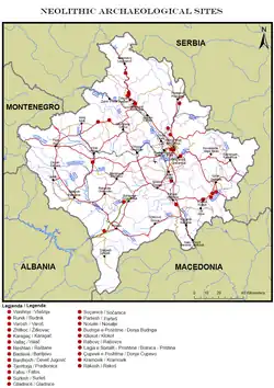 The settlement of Vlashnjë is located on the flat plateau of a raised rocky terrace 335 metres (1,099 ft) above sea level, on the Pristina-Zhur road about 6 kilometres (3.7 mi) west of Prizren. The toponym itself may refer to a nearby locality which was used at some point as grazing land by pastoral Vlachs. The site contains material from a number of periods, from the early Starčevo (early Neolithic) and Vinča cultures through the Copper, Bronze and Iron Ages to the Hellenistic, Late Antiquity and the Early Middle Ages. Archaeological evidence excavated at the site include clay pottery and vessel fragments, stone and bone tools, decorative and utilitarian artifacts and coins. They are comparable to material found at the nearby Prizren Fortress (~10 km to the east of Vlashnjë).[2] Excavations took place in 2002, 2006-2008 and 2010 as part of a joint archaeological project of the universities of Tirana and Pristina. They covered a total area of 816 m².[3]