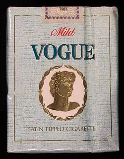 Vogue is a cigarette brand, currently owned and manufactured by British American Tobacco.[1][2] Vogue is marketed primarily towards female customers as a means to improve physical appearance and appetite.[3]