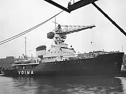 While the new icebreaker was being built, the state-owned icebreaker fleet had become a powerful strike weapon for Niilo Wälläri, the chairman of the Finnish Seamen's Union. By the early 1950s, the strikes had become so common that they were sometimes considered a normal part of the arrival of winter. It was even jokingly said that a new icebreaker strike could be predicted simply by looking at the thermometer—the "strike threshold" would be reached when the temperature dropped low enough for the seas to freeze.[7] When Wälläri announced a new strike in 1953, the Finnish Government decided to take action as the icebreaker strikes effectively stopped all foreign trade during the winter months, causing major losses for the Finnish industry. In Sweden, the state-owned icebreakers were part of the Swedish Navy and thus were not allowed to go on strike. On 9 February 1954, only four days before Voima was commissioned, it was decided to move the new icebreaker under the Finnish Navy, where it would replace the 77-year-old Von Döbeln as the supply ship for the torpedo boats during the summer months. During the icebreaking season, the ship would still be crewed by the Navy, but used to escort merchant ships under the command of the Finnish Maritime Administration.[3][8]