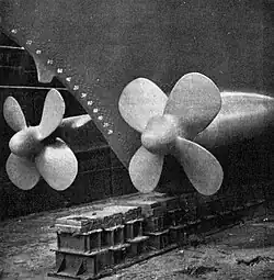 The propeller shafts that connect the propulsion motors to the four-bladed steel propellers and the rudder stock all have a diameter of 400 millimetres (16 in). The 3.5-metre (11 ft 6 in) bow propellers weigh 8,360 kilograms (18,430 lb) while the bigger stern propellers have a diameter of 4.2-metre (13 ft 9 in) and weigh 9,800 kilograms (21,600 lb) each.[3] Both the propellers and the propeller shafts were retained in the refit.[22] The original steering arrangement, a single center rudder mounted at the sternpost,[12] was also retained although newer icebreakers have twin rudders for improved manoeuvrability.