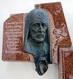 ![]() Memorial plaque to Patriarch Volodymyr on the facade of the Holy Protection Church in Kyiv | |