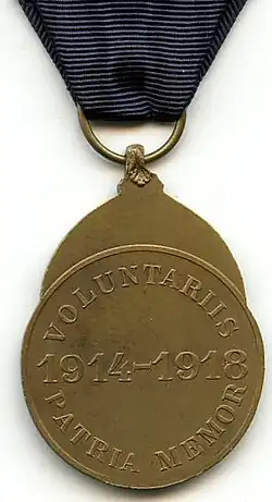 The Volunteer Combatant's Medal 1914–1918 (French: Médaille du Combattant Volontaire 1914–18, Dutch: Medaille van de Vrijwillige Strijder 1914–1918) was a Belgian wartime service medal established by royal decree on 17 June 1930 and awarded to Belgian citizens and foreign nationals who voluntarily enlisted for service in the Belgian Armed Forces during World War I.[1]