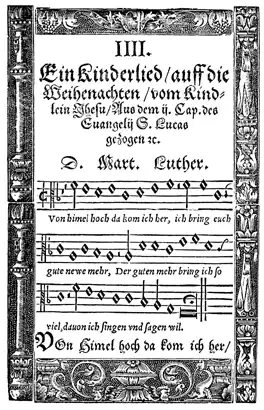 "Vom Himmel hoch" was first published in 1535 as a hymn with 15 stanzas of four lines in Geistliche Lieder auffs new gebessert (also known as the Klugsches Gesangbuch), under the header "Ein kinderlied auff die Weinacht Christi" ("A children's song on the Nativity of Christ"). In that publication, the text was coupled to the melody of the then well-known secular song "Ich kumm aus frembden Landen her," Zahn 345.[3] It was Luther's only contrafactum, reusing a tune of a secular composition for a religious text.[2][4]