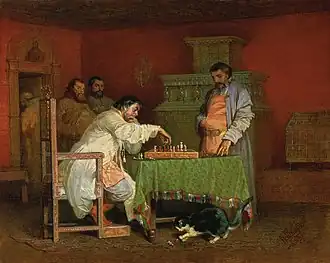 While at the Lyceum, his drawings attracted the attention of the art faculty and he was able to study under Arseny Meshchersky, who introduced him to oil painting. In 1859, he was graduated with a gold medal and the rank of "Class IX" in the Civil Service. Later that year, he was given permission to audit classes at Saint Petersburg State University, where he came under the influence of Nikolay Kostomarov. He had already begun attending classes at the Imperial Academy of Arts, to study military art with Bogdan Willewalde[2] but, fascinated with Professor Kostomarov's lectures, his first paintings were devoted to ancient Russian history.