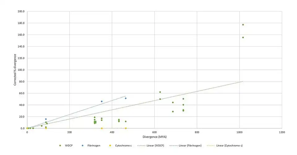 The graph to the right shows the rate of evolution of WDCP in comparison to the evolution rate of the fibrinogen alpha-chain (NCBI: NP_068657) and cytochrome c (NCBI: NP_061820). As seen in the graph to the right, the evolution rate of WDCP is faster than that of cytochrome c, but slower than the evolution of the fibrinogen alpha-chain.