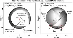 Shortly after periastron passage every eight years, the infrared brightness increases dramatically and then slowly drops again over a period of months.[8] Here stellar winds collide with the dust formation created by the Wolf–Rayet star, causing the unusual bulges and angles in the concentric shells of dust.[11] The dust typically emitted by Wolf–Rayet systems is not so coherent or concentric as those of WR 140. The dust lanes around Wolf–Rayets are most commonly observed as some variety of spiral. This is thought to be the result of the dueling solar winds in binary systems, which compress clouds of dust into distinct shock fronts. The concentric nature of WR 140's dust shells is not well understood, although it may be related to nuclear processes in the Wolf–Rayet star's core.