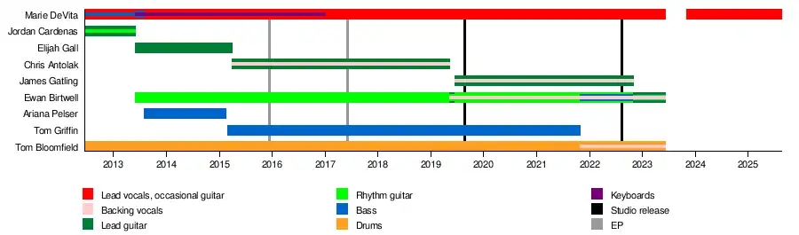 - Marie "Maz" DeVita – lead vocals, occasional guitar (2012–2023, 2023–present), bass (2012–2013), keyboards (2013−2017)