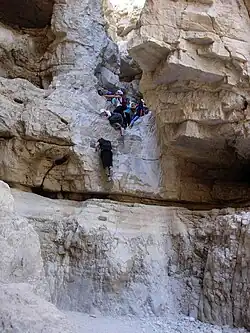 On the course of the wadi are the ruins of the Monastery of Theoctistus, known in Arabic as Deir Muqallik.[7] They are hard to access, being situated quite high on the steep northern bank of the wadi at the spot where the valley deepens, turning into a canyon.[7] According to Byzantine sources, it was established in the 5th century by Euthymius and Theoctistus[7] (for more about the monastery see these two articles). Archaeologists confirm that the main phase of the cave church complex and related structures date back to the 5th-7th century, the monastery's 'golden era', with signs of a far less significant habitation period during the Early-Mid Muslim period in the 7th-11th or 12th century.[7] The cave church complex was established at the beginning of the 5th century, and at the end of the 8th the monastery was deserted.[7]