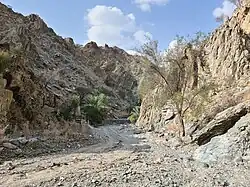 Wadi Tayyibah is a seasonal watercourse, or wadi, in the Hajar Mountains of Fujairah, United Arab Emirates. It runs from the village of Tayyibah to join the Seih Dibba or Dibba Plain, where it fans out into the plain. Prior to 1960, Wadi Tayyibah provided the main route from Masafi to Dibba and sections of tarmac are still visible, particularly on the lower reaches of the wadi as it approaches the village of Al Hala.[1]