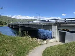 The Waione Street Bridge (also known as the Hutt Estuary Bridge) is a bridge across the Hutt River in Lower Hutt, New Zealand that was completed in 1954. The bridge is notable because it was the first substantial bridge in New Zealand to be constructed using prestressed concrete beams.[1][2] The bridge connects Petone with Seaview, and carries Waione Street with one lane in each direction. It also carries major water pipes across the Hutt River. There is a pedestrian walkway on the south side.[1] The bridge has 5 main spans, each of 32 m (105 ft) length, supported with four piers installed into the bed of the river.[3]