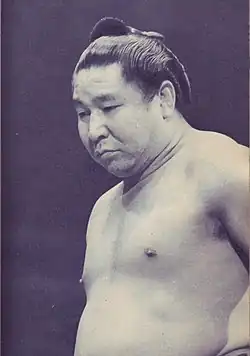 Born Hanada Katsuji (花田 勝治) in Hirosaki, Aomori Prefecture, he moved to Hokkaidō as a child. After working as a stevedore, he was scouted by the maegashira Onoumi,[1] joining Nishonoseki stable in November 1946. He was trained harshly by Rikidōzan in Nishonoseki stable, and reportedly bit Rikidōzan's leg in retaliation for his training.[2] He began sumo with the shikona or ring name Wakanohana Yoshimi (若ノ花 義美), before changing its given name to his real one in May 1948. Onoumi became head coach of Shibatayama stable after his retirement in May 1952, and Wakanohana followed him to the new stable. It was renamed Hanakago stable in September 1953.