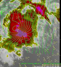 Wake lows form due to adiabatic warming in the wake of mature squall lines at the back edge of their rain shields, where evaporative cooling is unable to offset warming due to atmospheric subsidence, or downward motion. They can be caused by gravity waves which duct through boundary layers which are deep and cold to the north of a weather front. As with mesoscale high-pressure areas behind a squall line, when new thunderstorm development stops along the squall line, the wake low will weaken as well. Clearing conditions will accompany the wake low, due to the descending warm air mass associated with the feature.[4] Within the United States, these systems have been observed to form in the Mississippi River valley,[3] Southeast,[5] Florida, and Great Plains.[6] A wake low producing strong northeasterly winds of 70 to 80 mph (110 to 130 km/h) and very rough seas was determined to be responsible for the capsizing of the Seacor Power lift boat (according to the National Weather Service) with 13 mariners drowned or missing.[7]