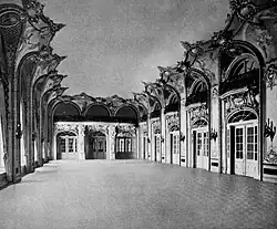 The Empire Room was the largest and most lavishly adorned room in the Waldorf, and soon after opening it became one of the best restaurants in New York City, rivaling Delmonico's and Sherry's.[69] It was modelled after the grand salon in King Ludwig's palace at Munich, with satin hangings, upholstery and marble pillars, all of pale green, and Crowninshield's frescoes.[70] Empire in style, the Waldorf's restaurant featured feathered columns of dark-green marble, and the pilasters that were opposite were of mahogany, with ormolu work in the panels.[34] The caps and bases of both columns and pilasters were gilded. This treatment occupied most of the wall space. The ceiling was divided by heavy beams running from column to column, and between these the flat space was divided into oval and other shaped panels with light mouldings.[34] The color scheme was in tints of pale-green and cream. The panels of the ceiling were frescoed with figures in pinkish-red on a blue sky or field. The walls were principally mahogany and gold, with a little color in the comparatively small wall-spaces left between openings.[71] Among the other rooms were the Turkish smoking room, with low divans and ancient Moorish armor, and the ballroom, in white and gold, with Louis XIV decorations.[63]