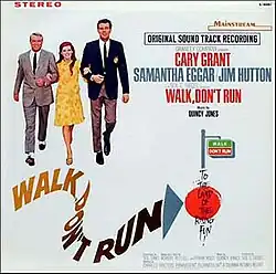 Walk, Don't Run is the soundtrack to the 1966 film of the same name composed by Quincy Jones. It was orchestrated by Jack Hayes and Leo Shuken.[2] Allmusic's Stephen Cook describes the score as having a "Henry Mancini inspired sound", with "excellent contributions from Toots Thielemans and Harry "Sweets" Edison".[3] Jones collaborated with Peggy Lee on the songs "Happy Feet" and "Stay with Me".[4] Jones was recommended to score the film for Cary Grant, who had met him through Lee.[5]